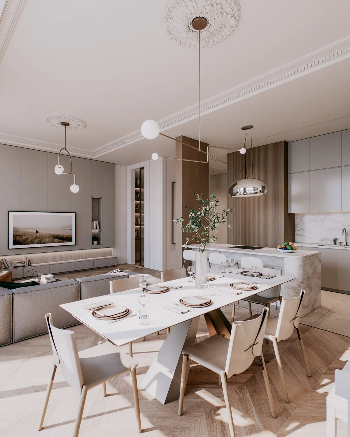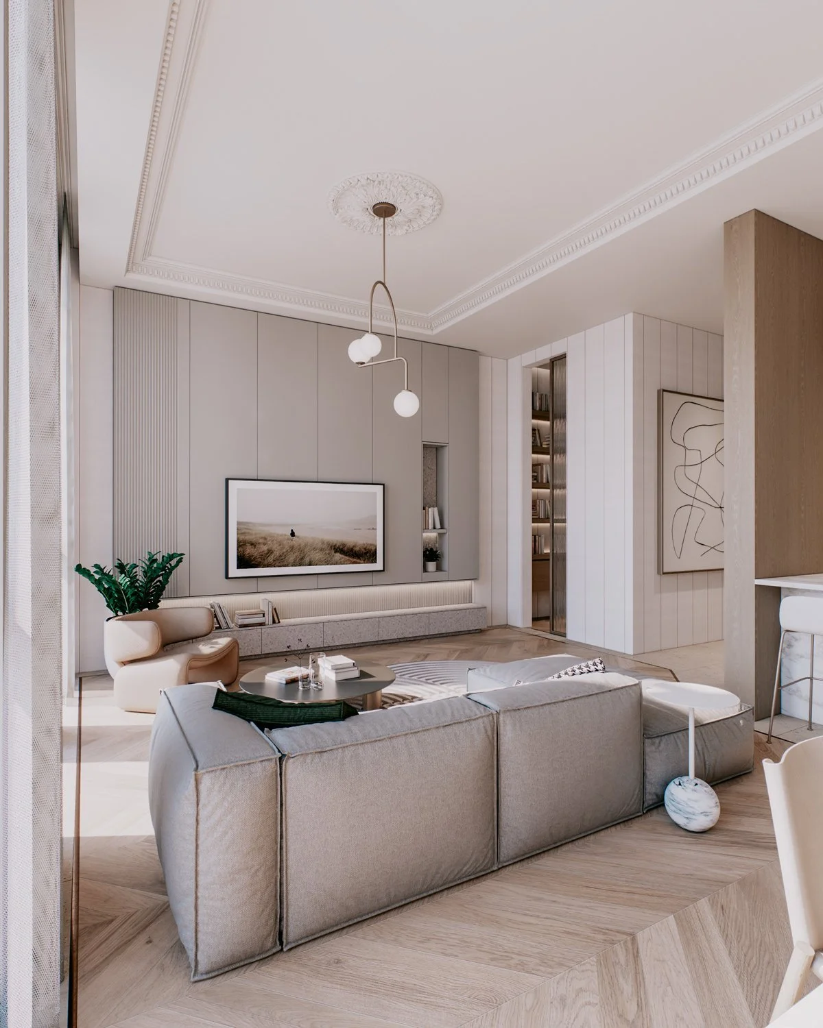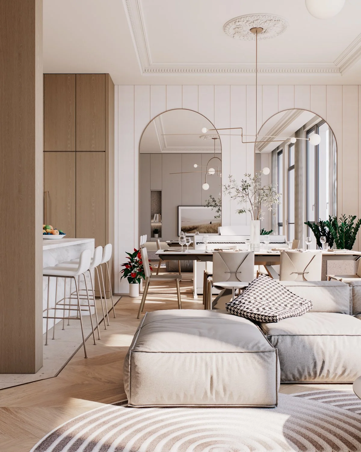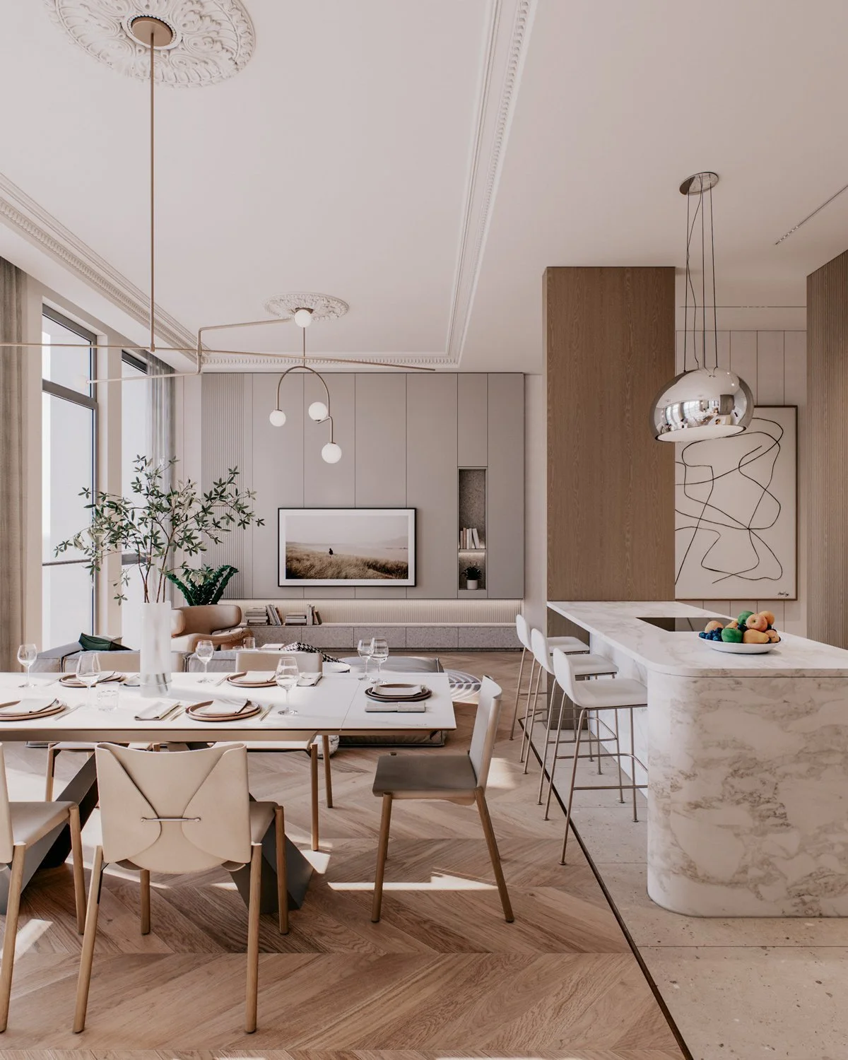A family of two with three children bought a new apartment to be designed from the ground up. The family wanted a modern elegance concept with soft and warm colors. Four bedrooms, a small working space, and an open living, dining, and kitchen in a total of 156 sqm.