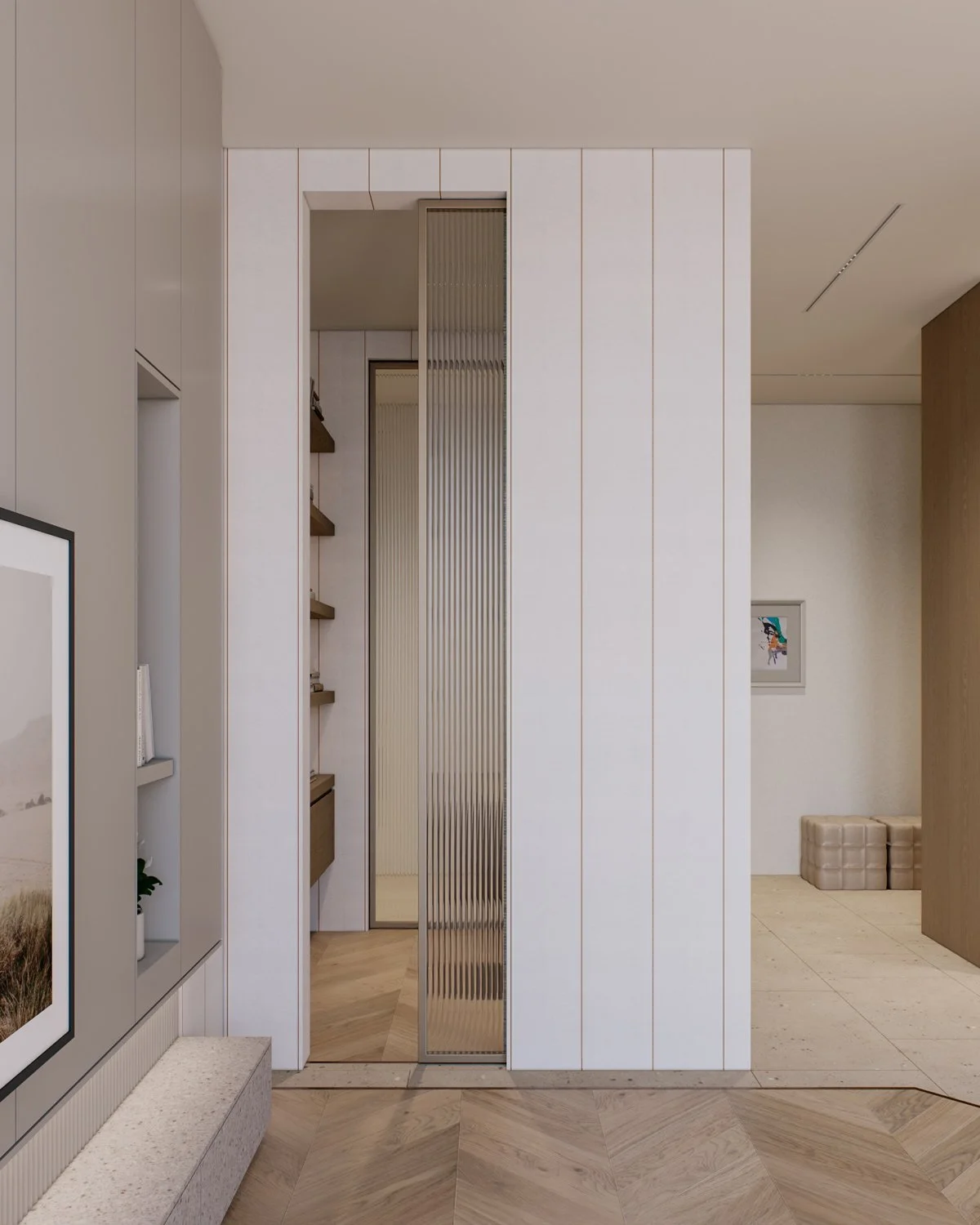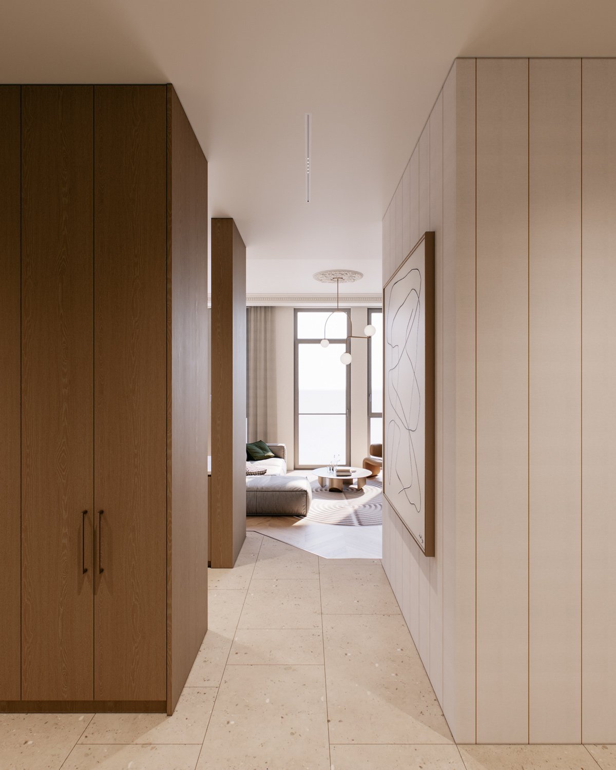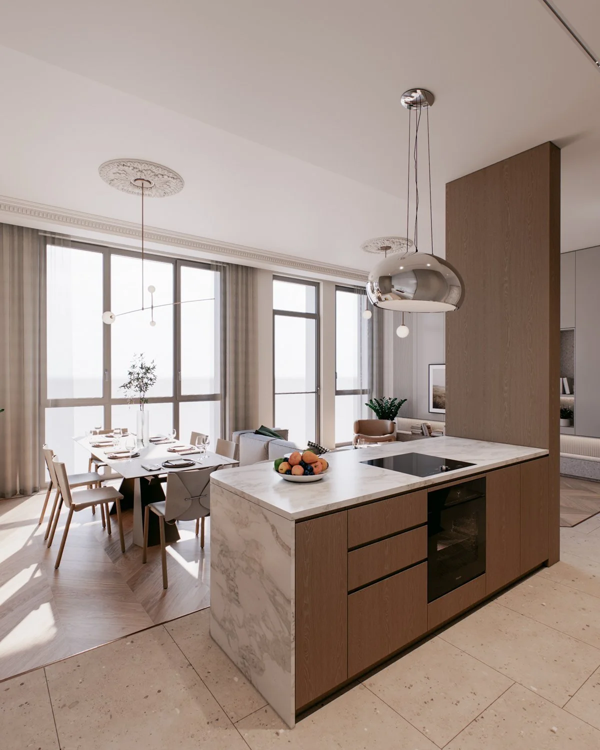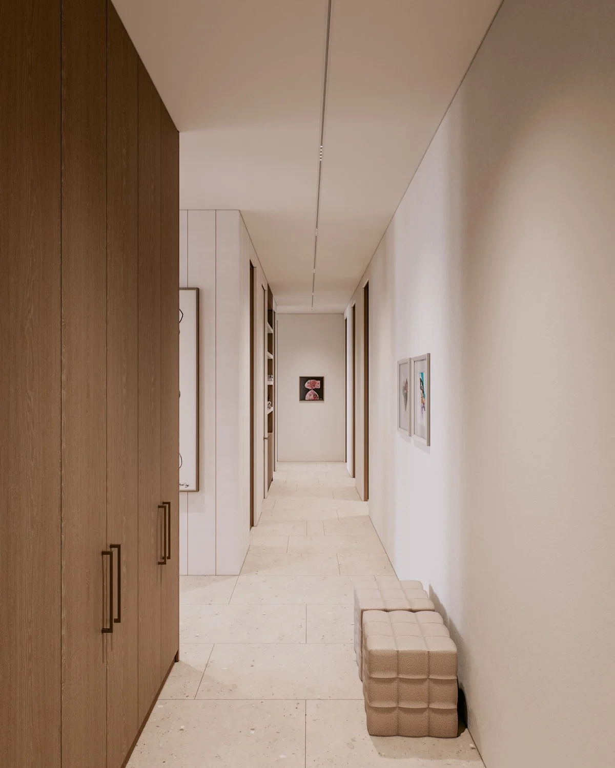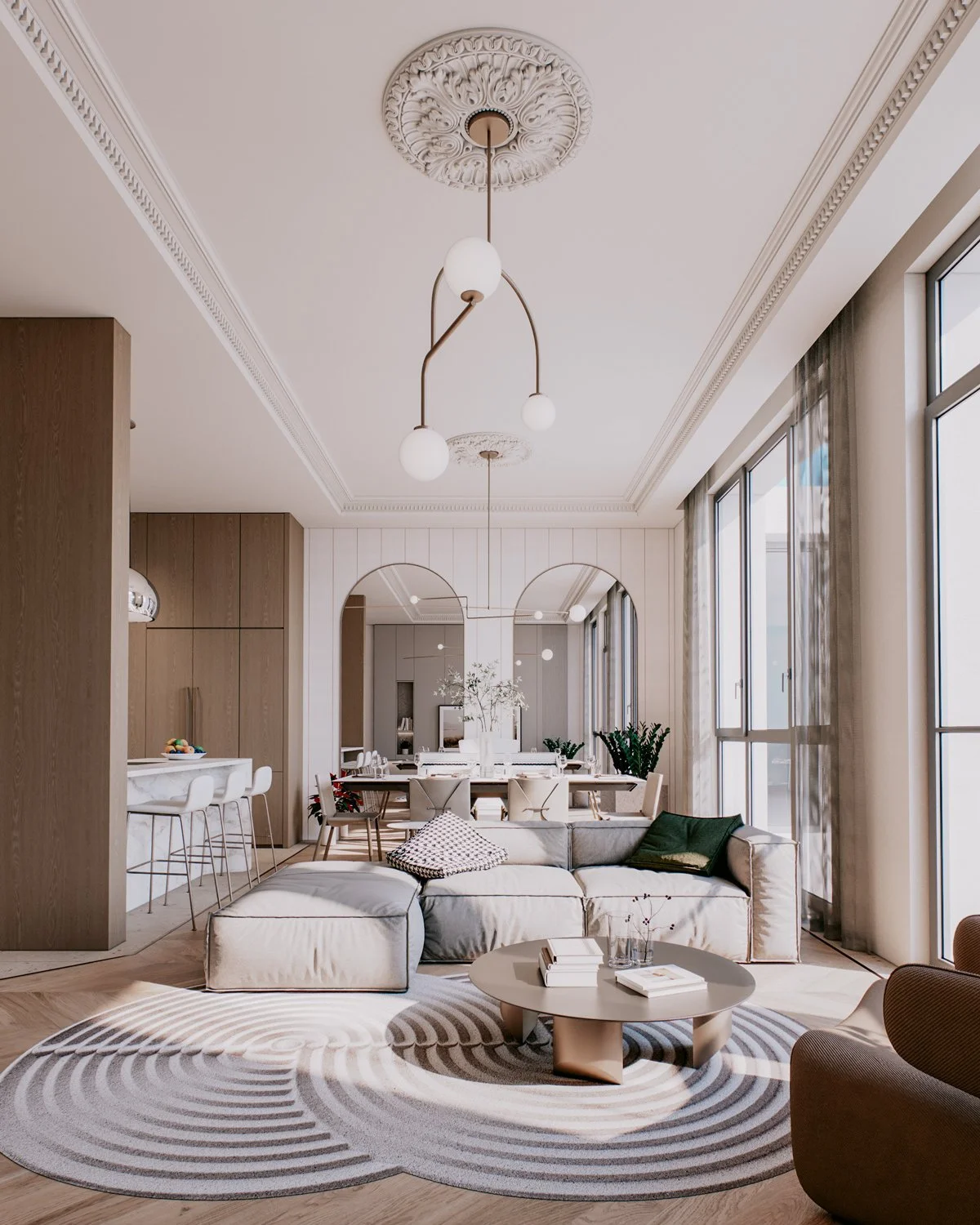 A family of two with three children bought a new apartment to be designed from the ground up. The family wanted a modern elegance concept with soft and warm colors. Four bedrooms, a small working space, and an open living, dining, and kitchen in a total of 156 sqm.
