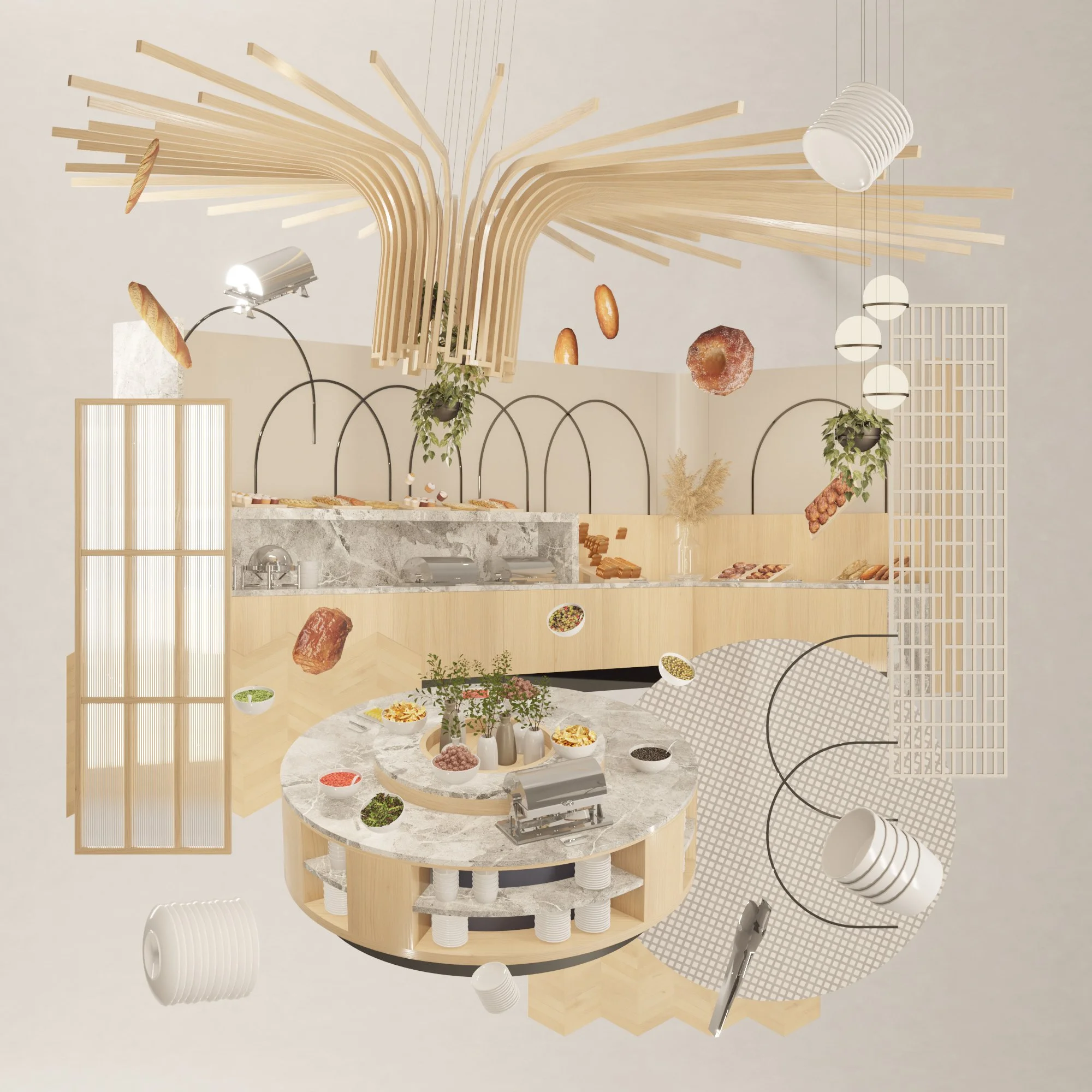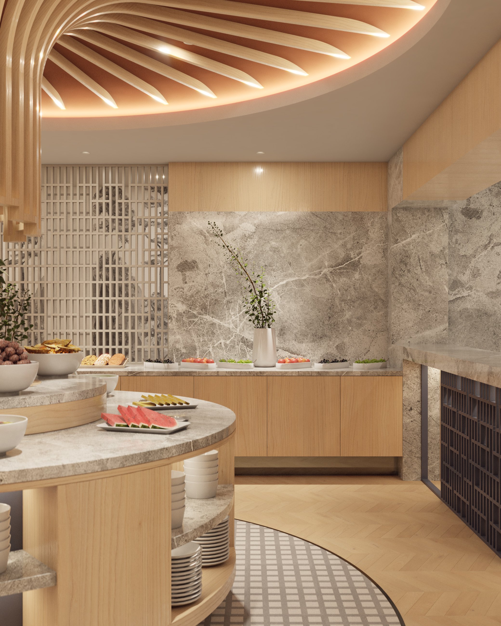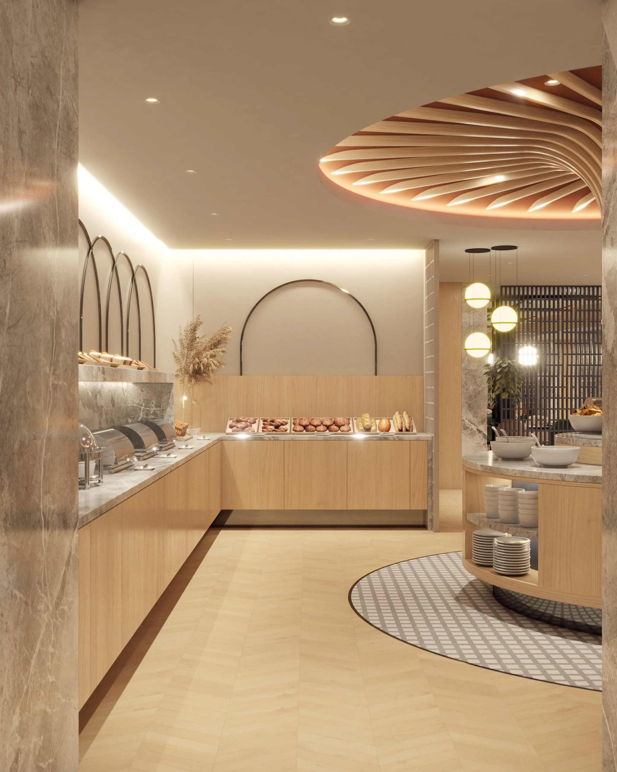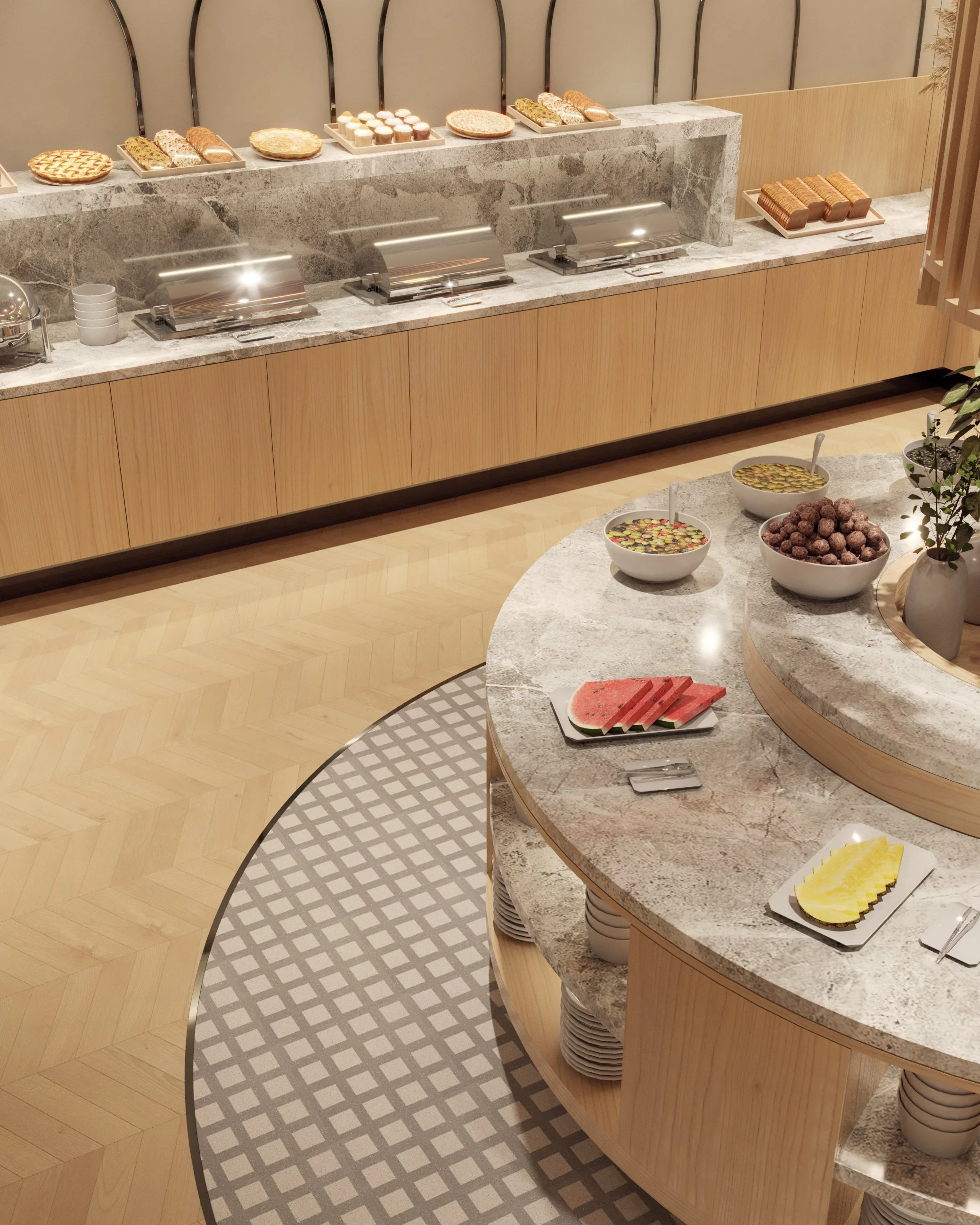 Client (Aksoy Group) wanted to have a breakfast lounge (around 320 sqm) with a communal table, a private dining room and an open-buffet bar serving 65 persons.