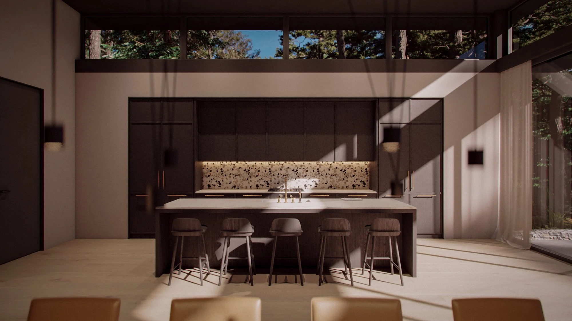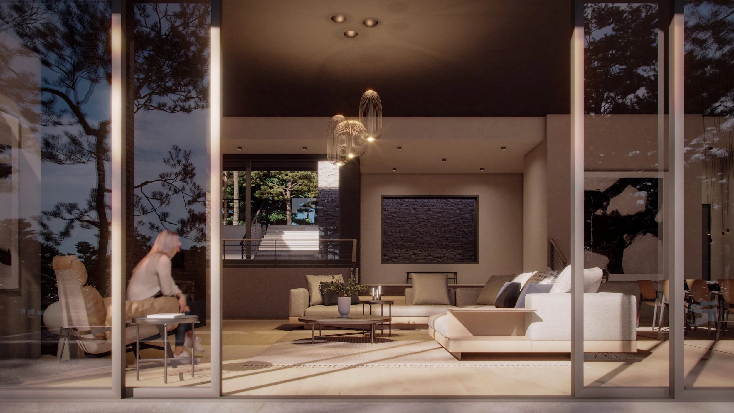 The client wanted a two-storey, modern-looking house that incorporates the slope into the main concept. We made a bold design decision and proposed a single-wide floor plan that looks single-level but also has sub-levels.
