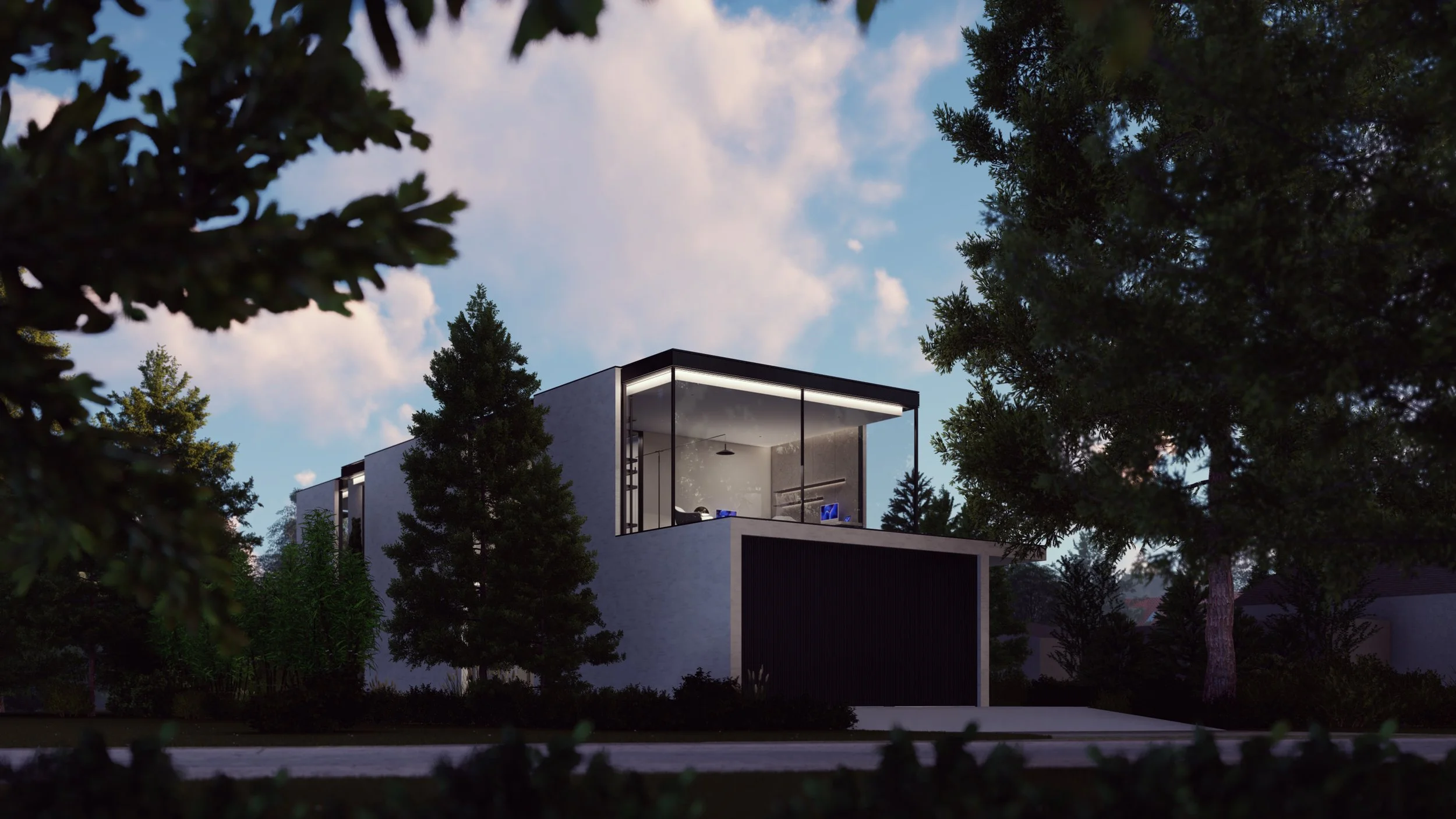 Two-storey house, 300sqm with two bedrooms plus a home office. It is located in the suburbs of Teltow, Germany. German couple wanted an iconic house for its modern and contemporary design. A goal is for natural light and functional open spaces, as well as a gallery that connects both floors. An existing 20-meter Douglas fir must kept on the front side.